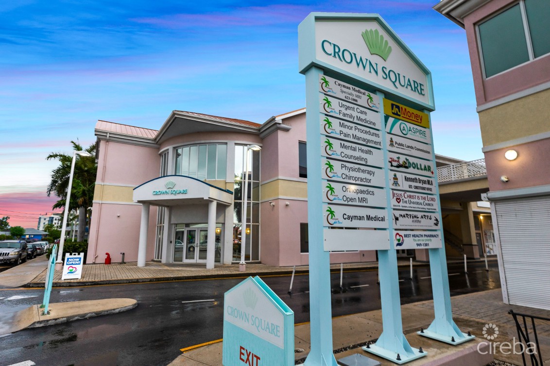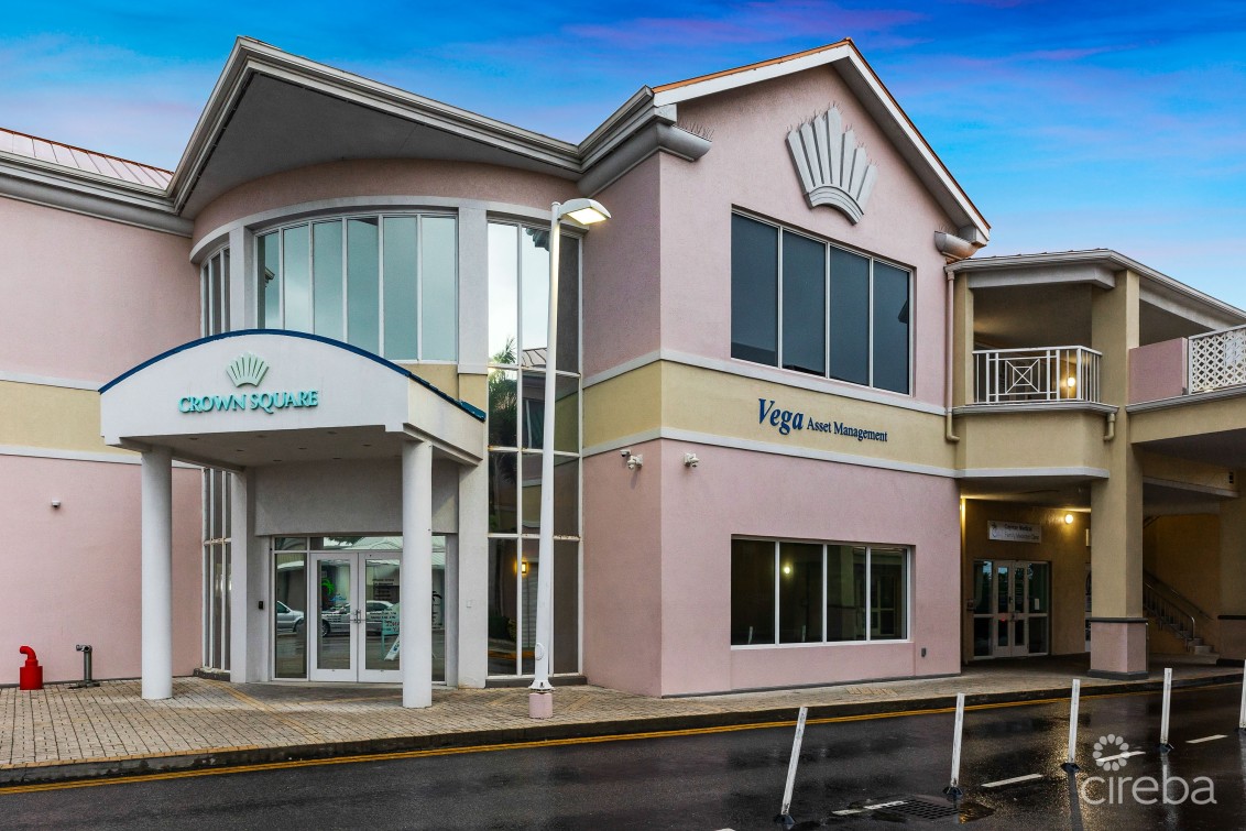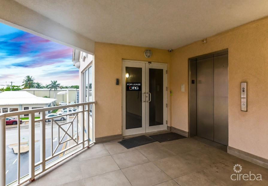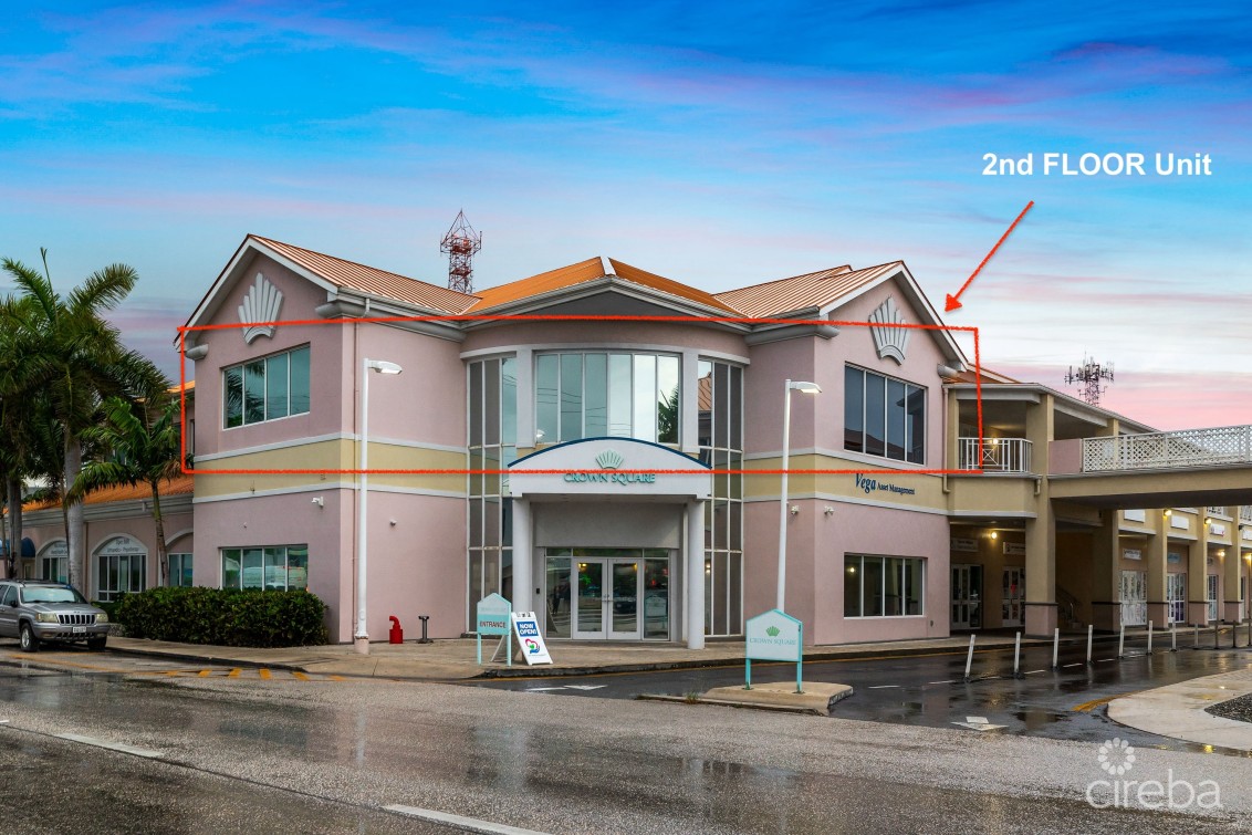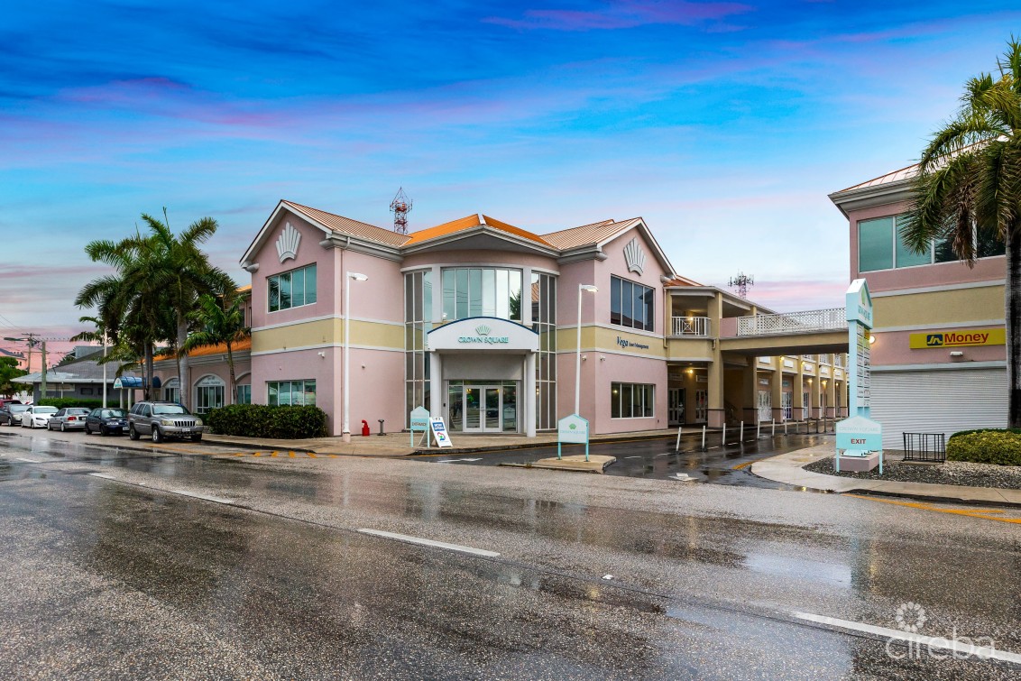 Crown Square is located toward the southern end of Eastern Avenue on the fringe of George Town. This flexible open plan space is partial vanilla shell fit out with wood floors and ceiling heights of approximately 17ft. Conveniently located on Eastern Avenue a busy connector road between Central George Town and West Bay Road. The 2nd floor unit has multiple bathrooms, lower level room previously fit-out as a gym for employees and changing rooms, kitchenette and areas that were previously converted to meeting rooms, along with a secured entry with reception/waiting room and elevator access directly into the unit from the ground floor. Ample on-site parking with covered parking available. This suite feature a back up generator.