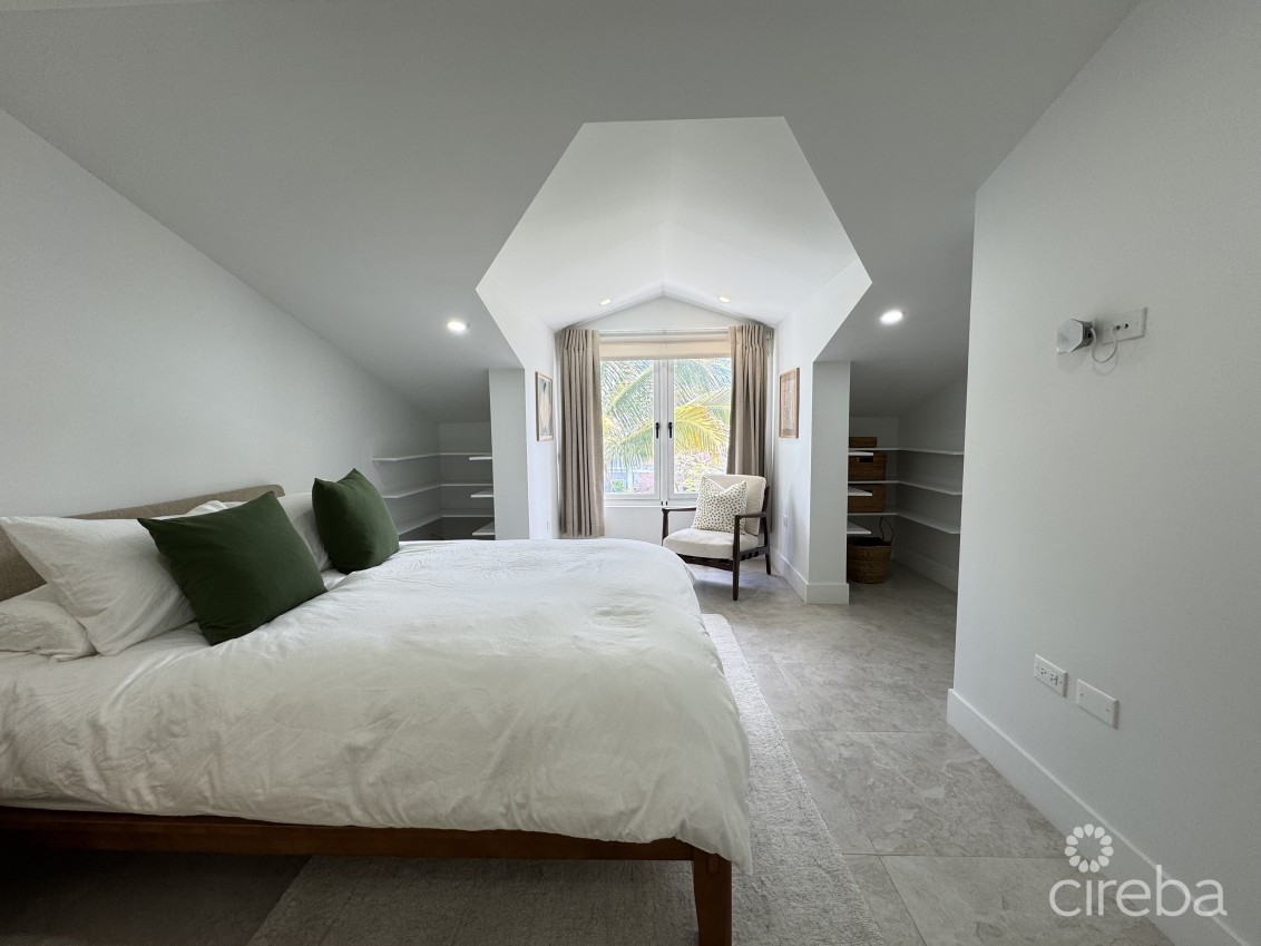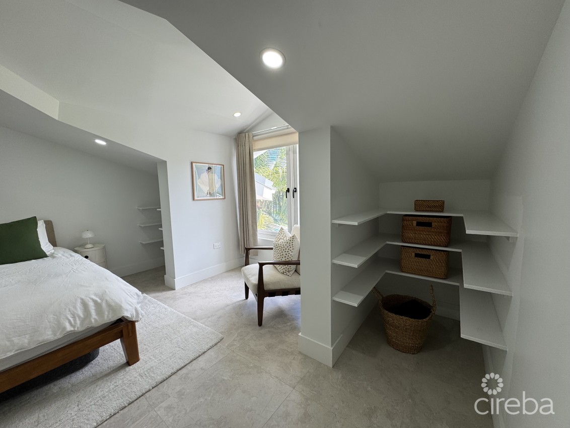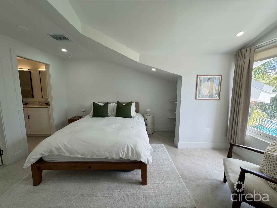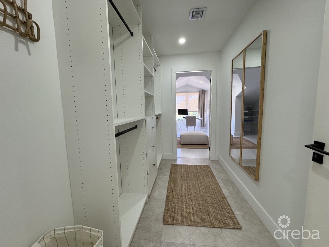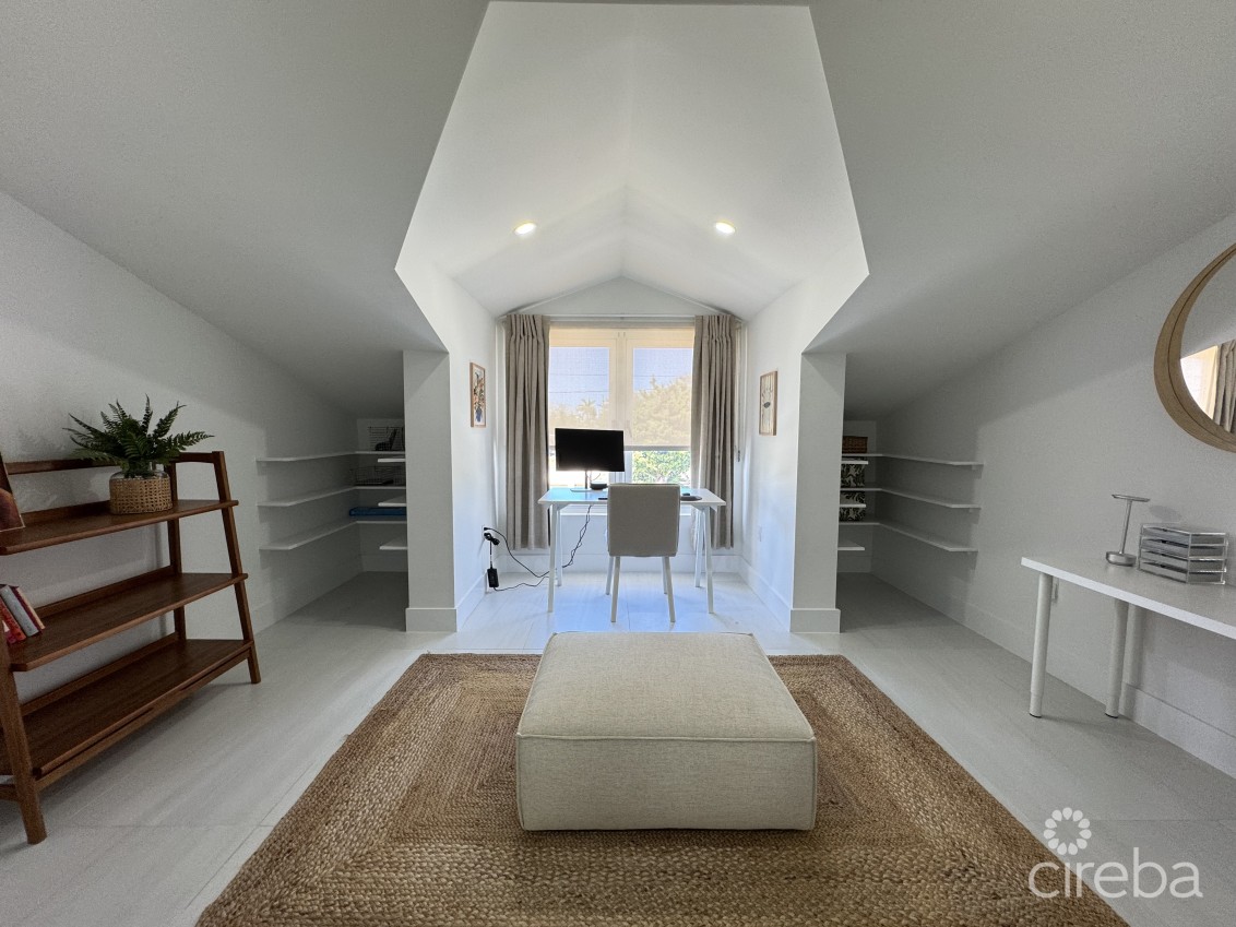 The master bedroom is located on the second floor with a walk-in closet, en-suite double bathroom, and lots of natural light from the large window overlooking the pool. A third upstairs room functions as a fully equipped study, ideal for working from home.