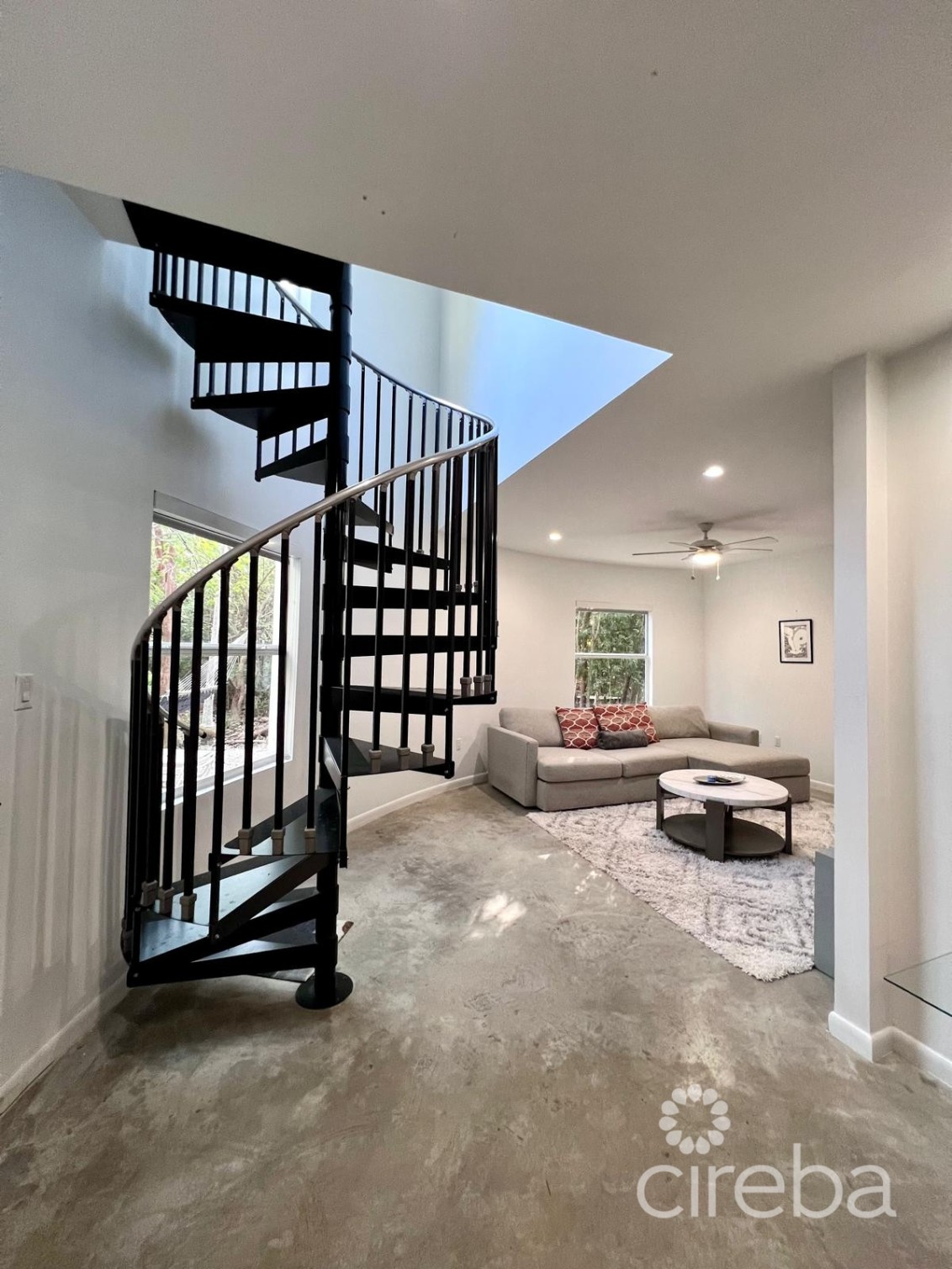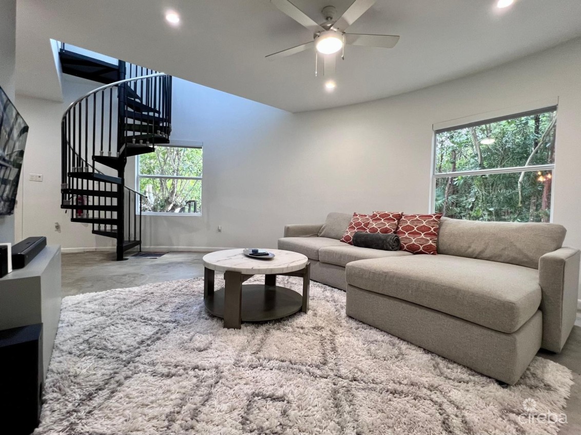 Mezzanine lounge connecting to upper terrace, primary suite, second bedroom, and second bathroom