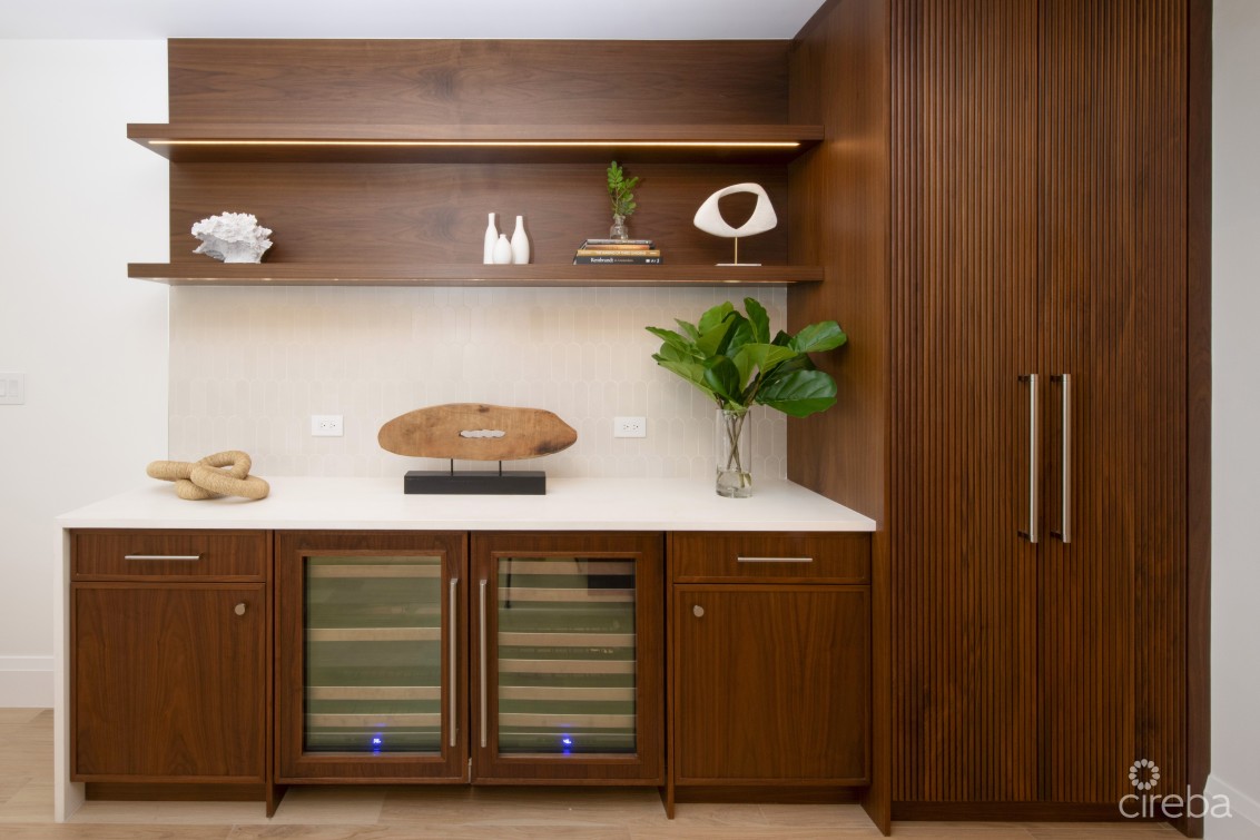 This meticulously designed four-bedroom, four-and-a-half-bathroom penthouse awaits you. Every bedroom features an en-suite bathroom, private closets, and breathtaking island and ocean views. Each bedroom has its own TV. The master suite is a true retreat with a spacious walk-in closet and a spa-inspired bathroom boasting a walk-in shower, private WC, and a freestanding glass-enclosed soaking tub. The interior hues of soft sand, whites, and natural woods create a serene ambiance, complemented by the finest designer furnishings and integrated high-end appliances. The open-plan kitchen has a large island, a walk-in pantry, and a separate wet bar with built-in cabinetry, which houses a wine & beverage fridge. Every detail of The Sands Penthouse exudes sophistication.