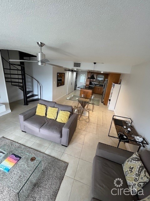 The spacious living area is at the heart of this townhome, offering plenty of room for relaxation and entertaining. Large windows bathe the space in natural light while framing stunning views of the sparkling ocean and the inviting pool. The open-plan design flows effortlessly into the dining area and kitchen, creating a seamless experience.