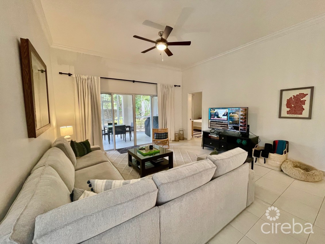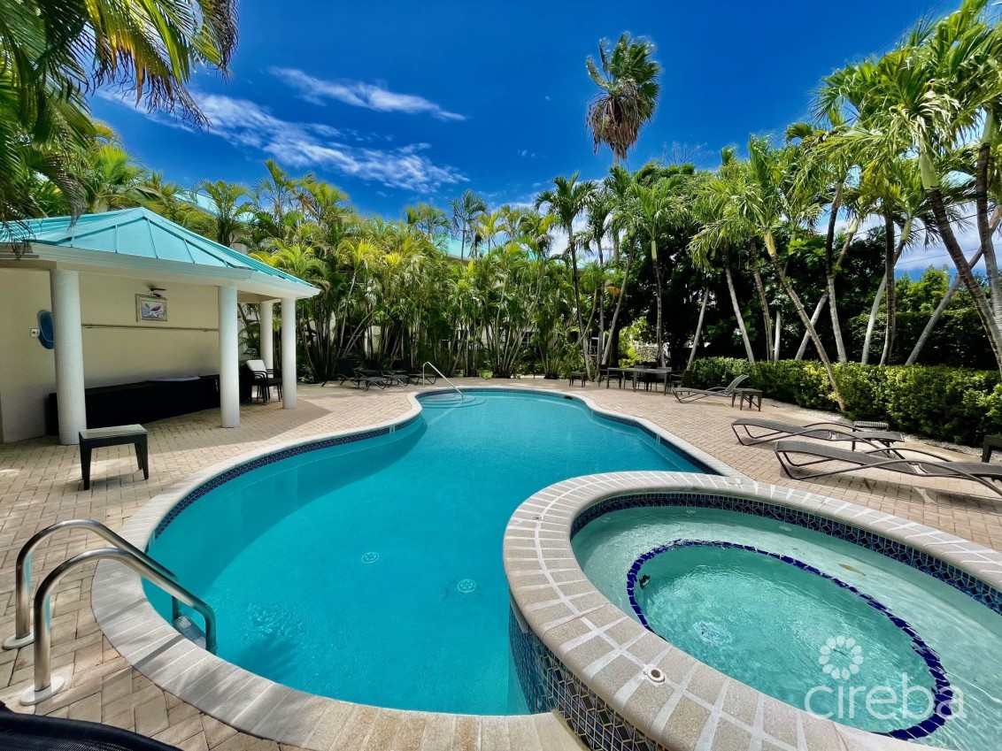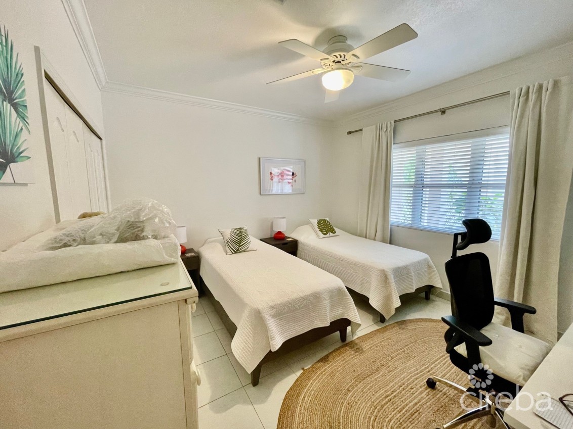 Absolutely lovely ground floor end unit at Grand Palms. This two bedroom, two bathroom residence is very spacious and private. Excellent kitchen with newer appliances, newer AC, new modern bathrooms. High vaulted ceilings and high end furniture throughout. This is a highly sought after development in a great area of South Sound/GT South. Walk to Smith Cove or Grand Old House or Sunset House.