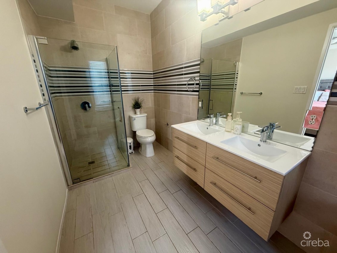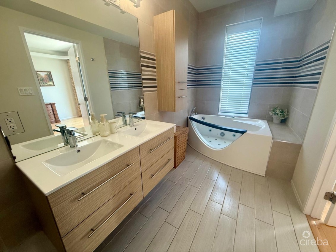 Upstairs, you'll find 3 spacious bedrooms, each with its own ensuite. The master suite offers views of the pool and gardens, plus a luxurious bathroom with a rain shower, Jacuzzi tub, and mood lighting. The laundry is conveniently located on this floor.