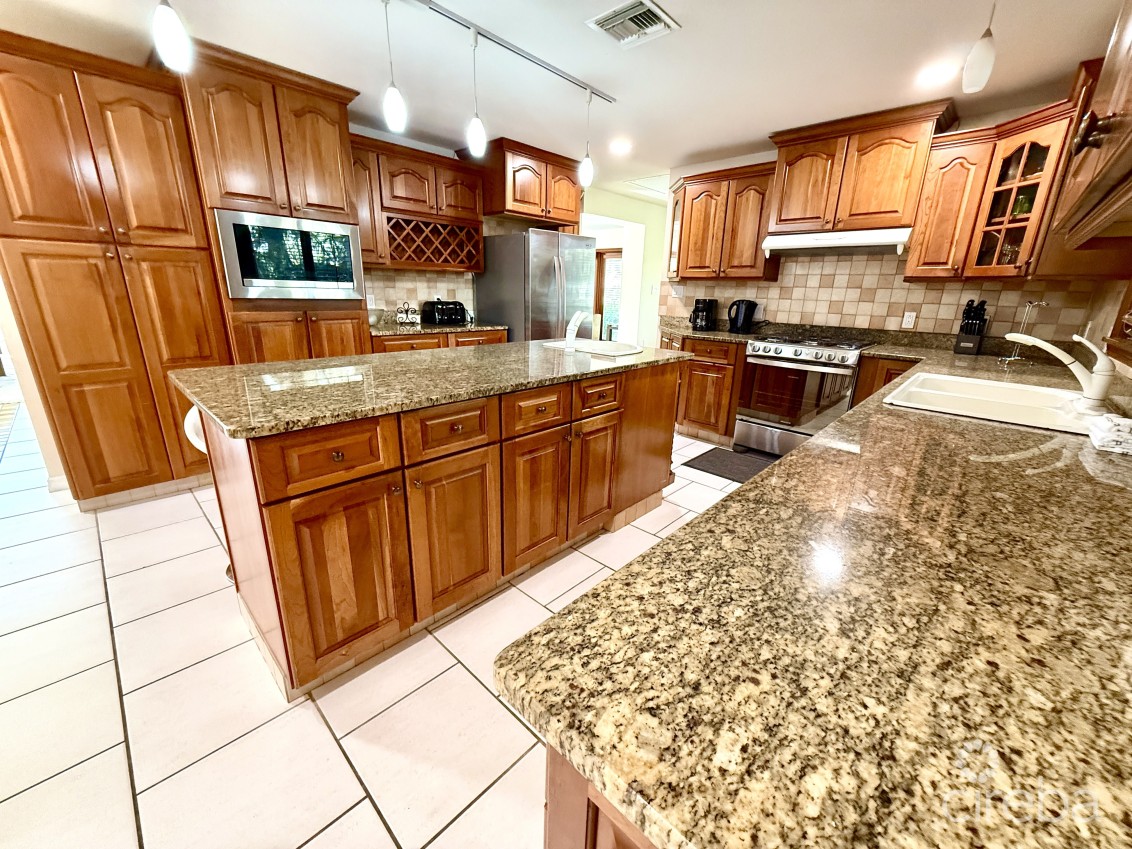 The well-equipped kitchen includes custom wooden cabinetry, gas stove, dishwasher, and a separate laundry room. The adjacent dining room opens onto a shaded patio with outdoor seating and BBQ area.