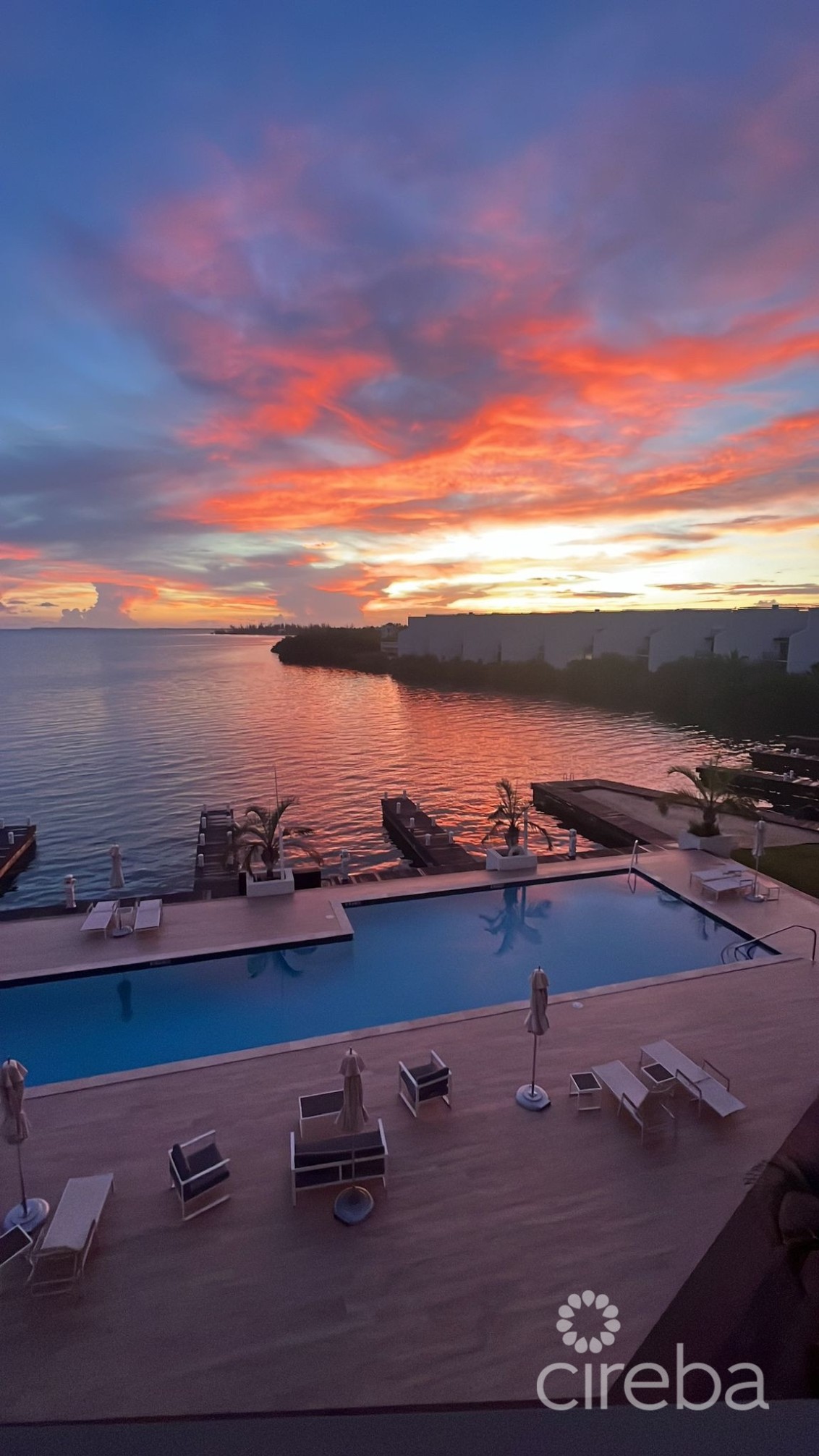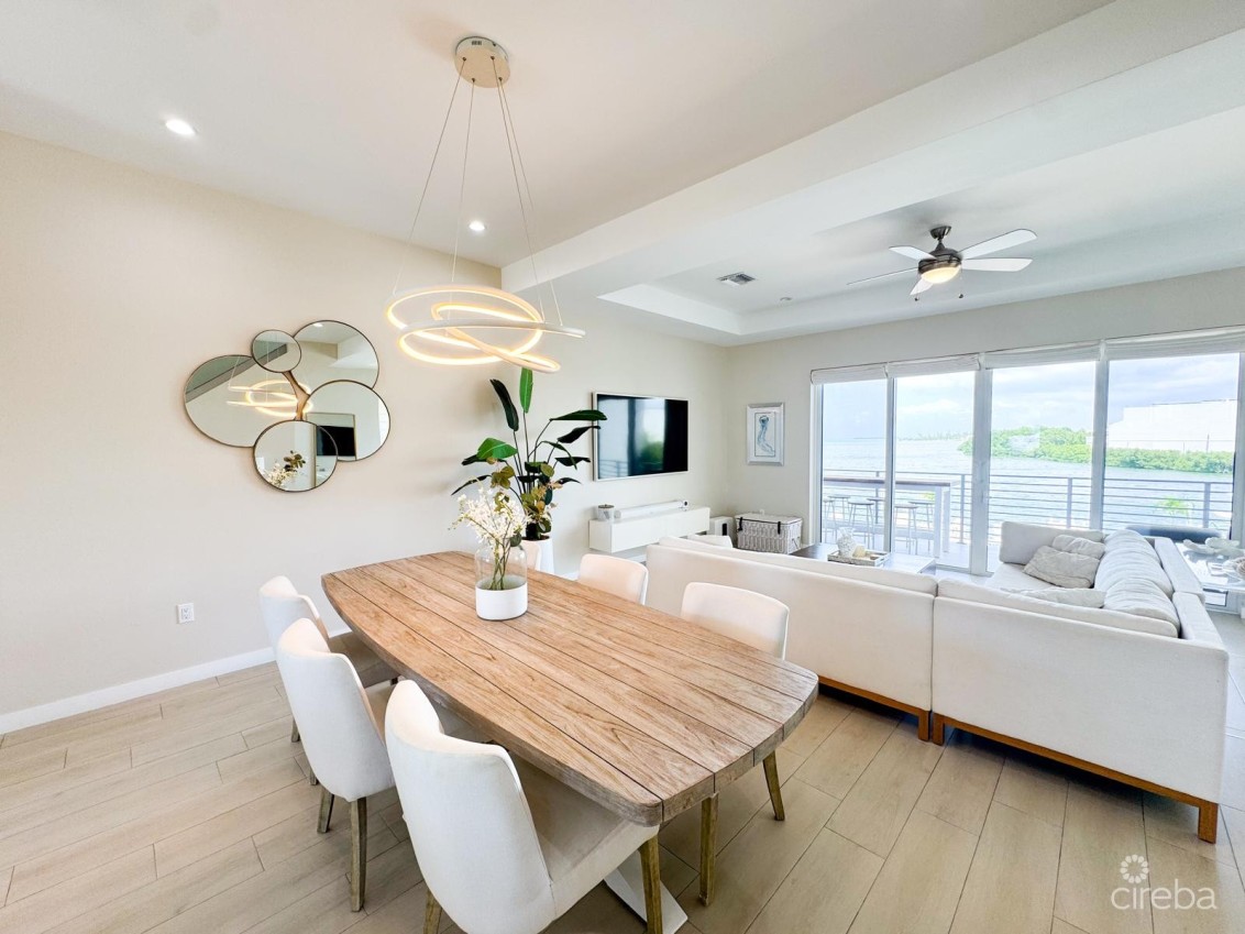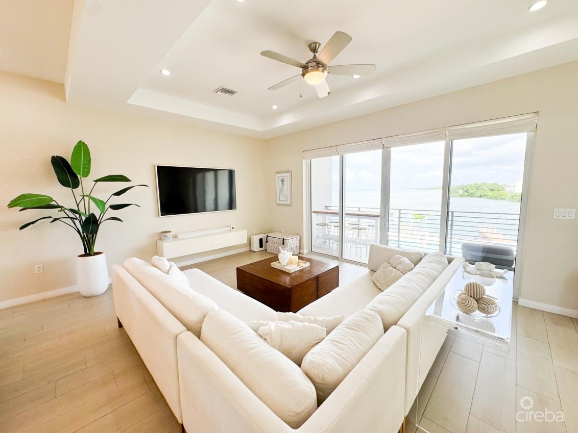 The elegant living area features a comfortable sectional sofa and Samsung Frame TV, while floor-to-ceiling windows and sliding doors open onto a private terrace with outdoor seatingyour front-row seat to stunning sunrises and spectacular sunsets over the water.