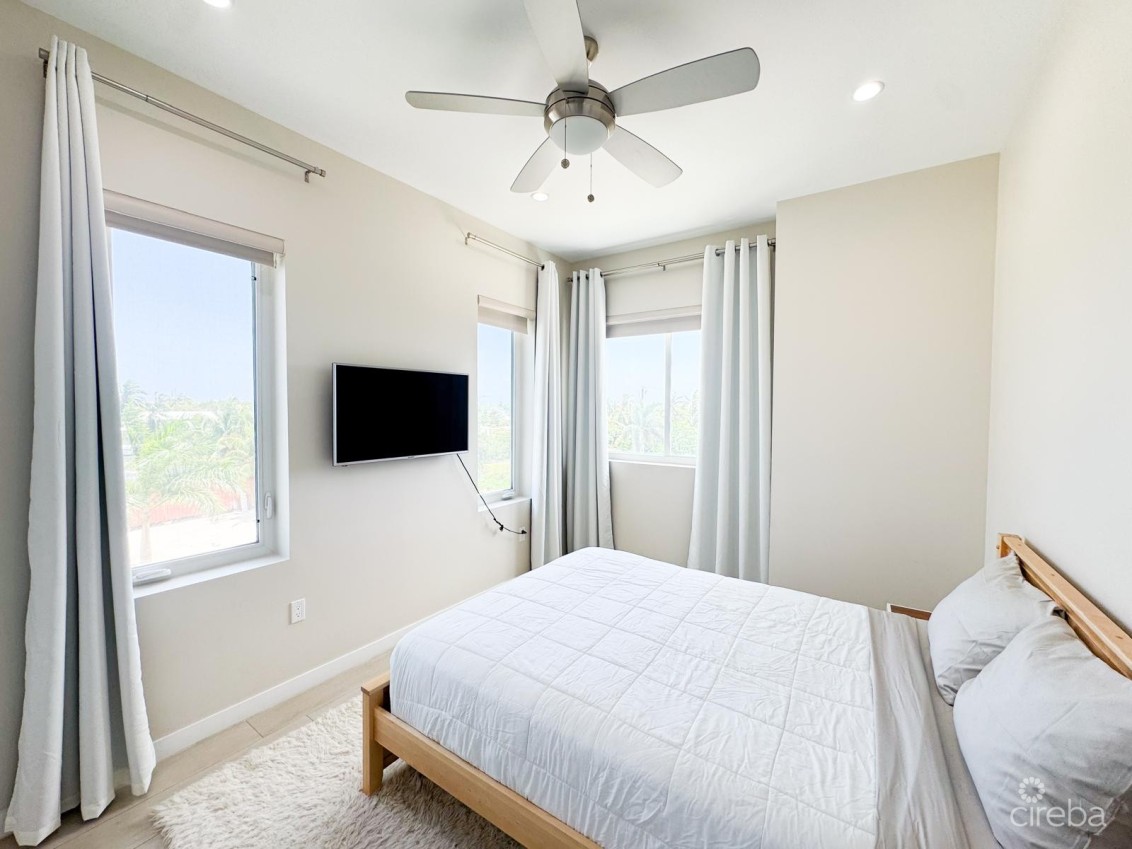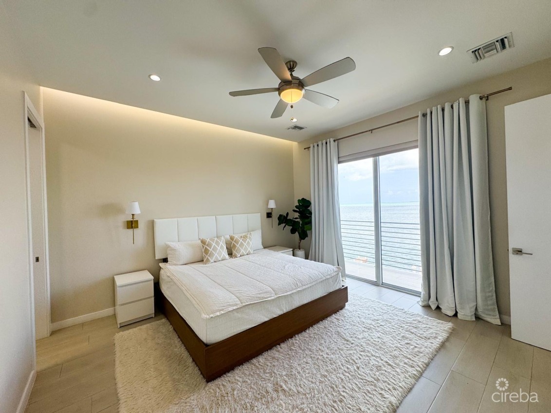 The upper level features three bedrooms and a fully-equipped laundry room with sink and additional storage. The spacious master suite is a true retreat, complete with a plush king bed, elegant wall sconces, a generous walk-in closet, and sliding glass doors that open to a private balcony overlooking the sea. Wake up to unobstructed water views every morning. The second bedroom offers a comfortable queen bed, a wall-mounted TV, and a serene, minimalist design perfect for relaxation. The third bedroom is a versatile, light-filled space ready to accommodate your needswhether as an additional guest room, home office, or children's room (children's room pictured)
