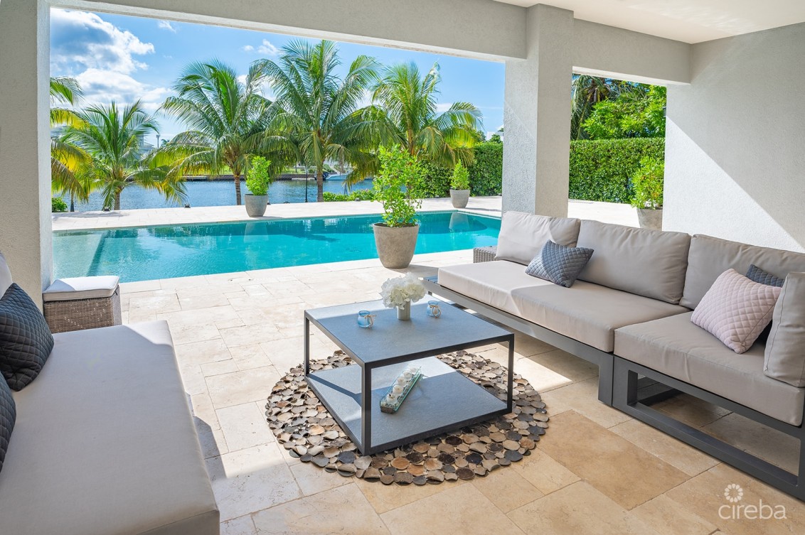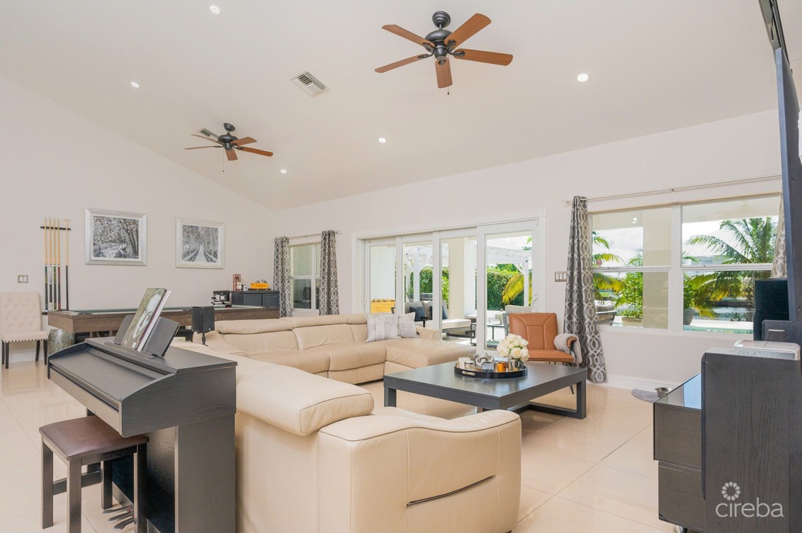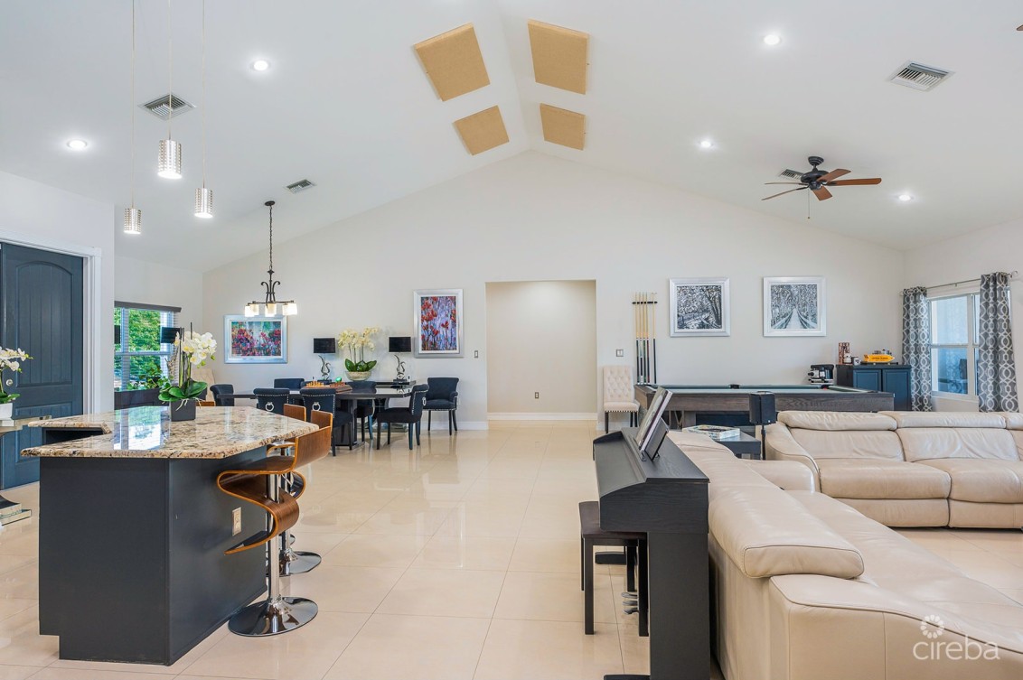 Located in one of Caymans most desirable gated communities, this stunning Grand Harbour home features an expansive open floor plan with cathedral ceilings and outstanding views overlooking the extensive covered patio, stunning pool deck and the extremely wide canal accessed via the composite 40ft dock.
