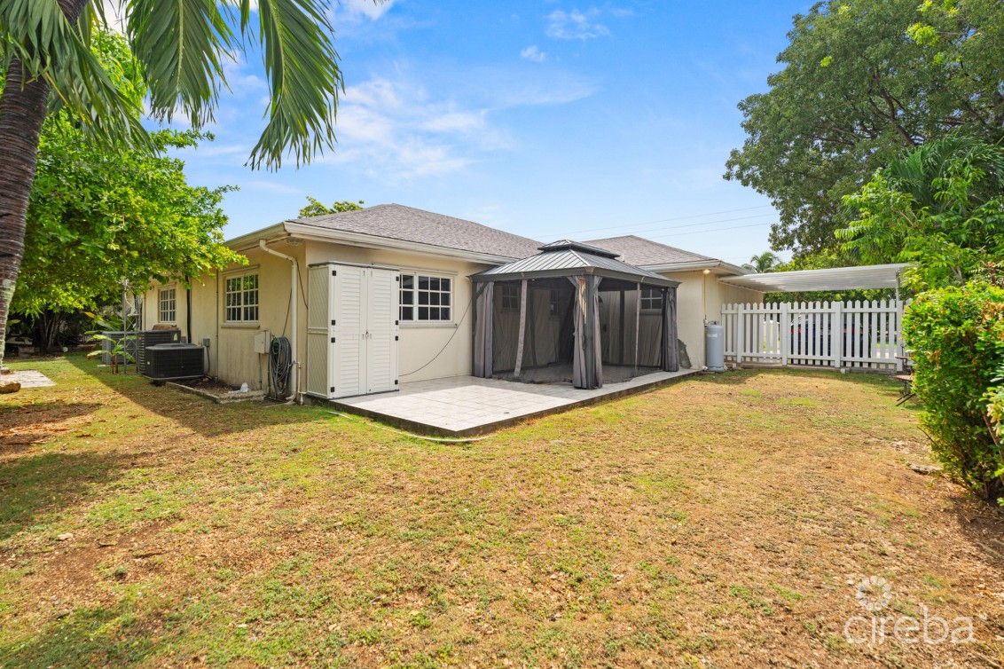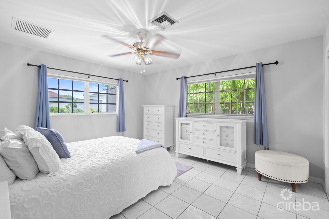 King bed in master, queen bed in second bedroom. Fenced garden with patio, and screened area with sparkly lights and fan.