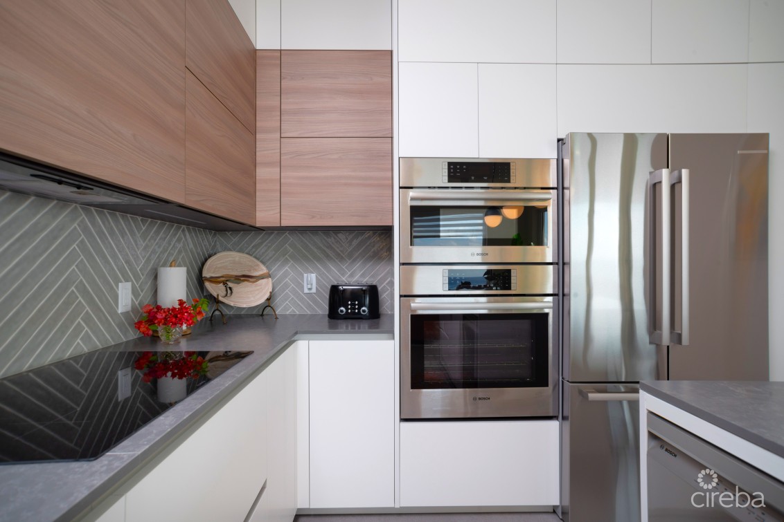 The kitchen features Bosch appliances, custom cabinetry with quality finishes, and a large island with counter seating. The adjoining living area provides an inviting setting for relaxation, while a private patio offers additional space for outdoor dining or casual gatherings.