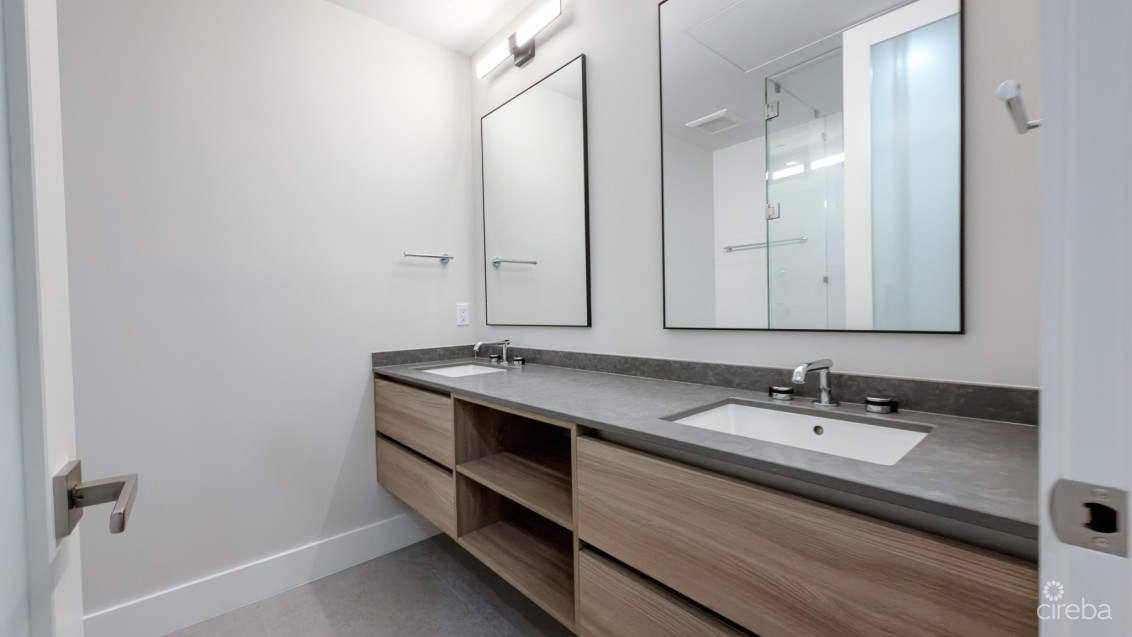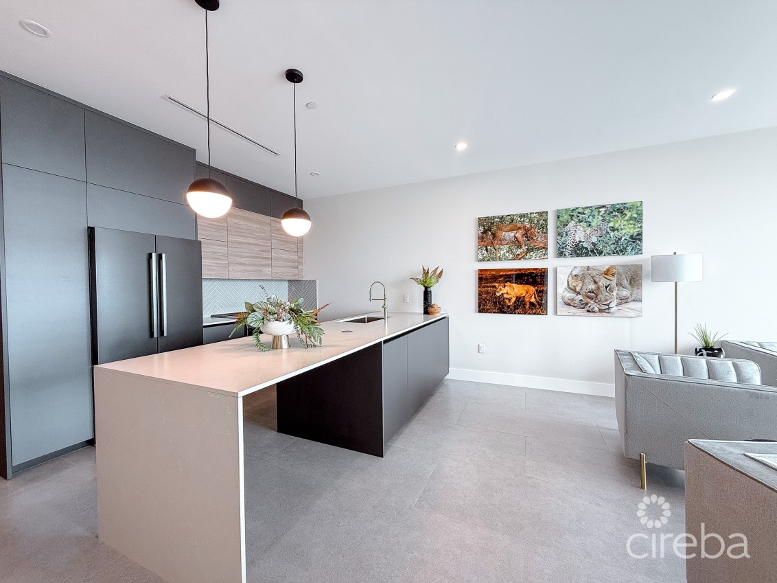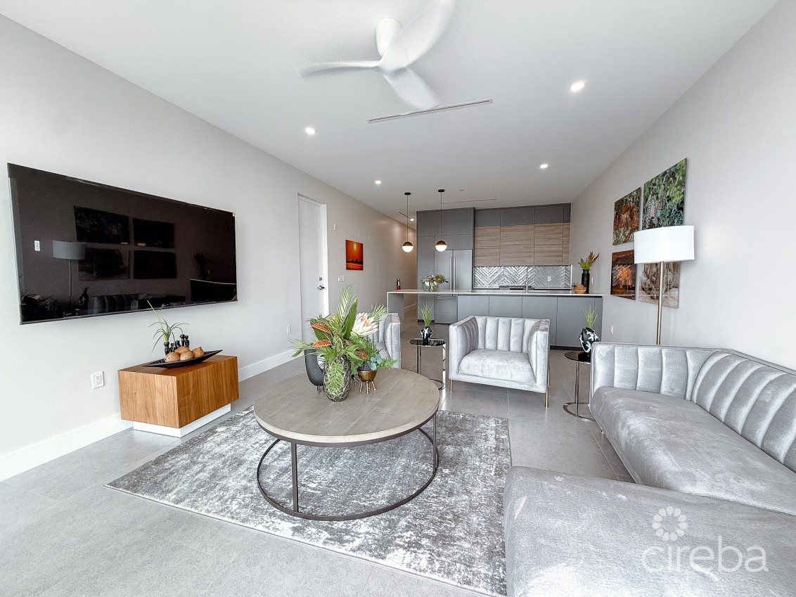 This stunning 2-bed, 2-bath waterfront condo is ideal for professionals, couples, or those relocating to Grand Cayman who appreciate design-forward living and oceanfront ambiance.