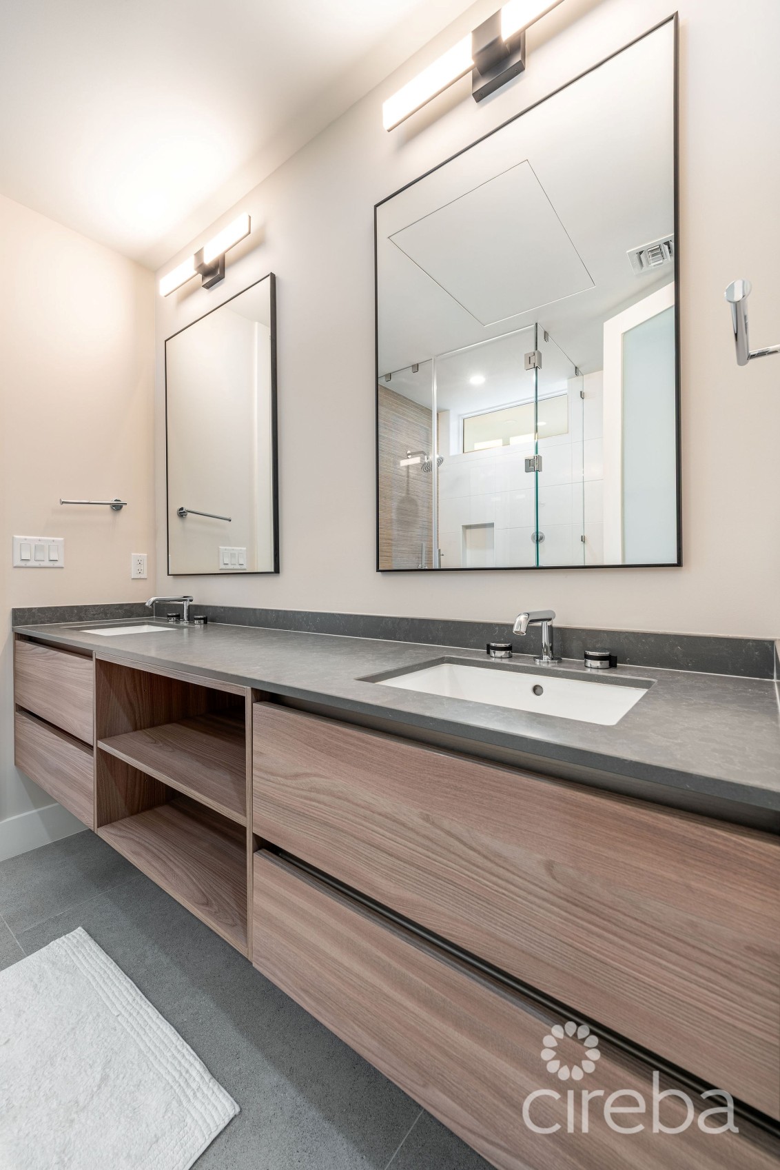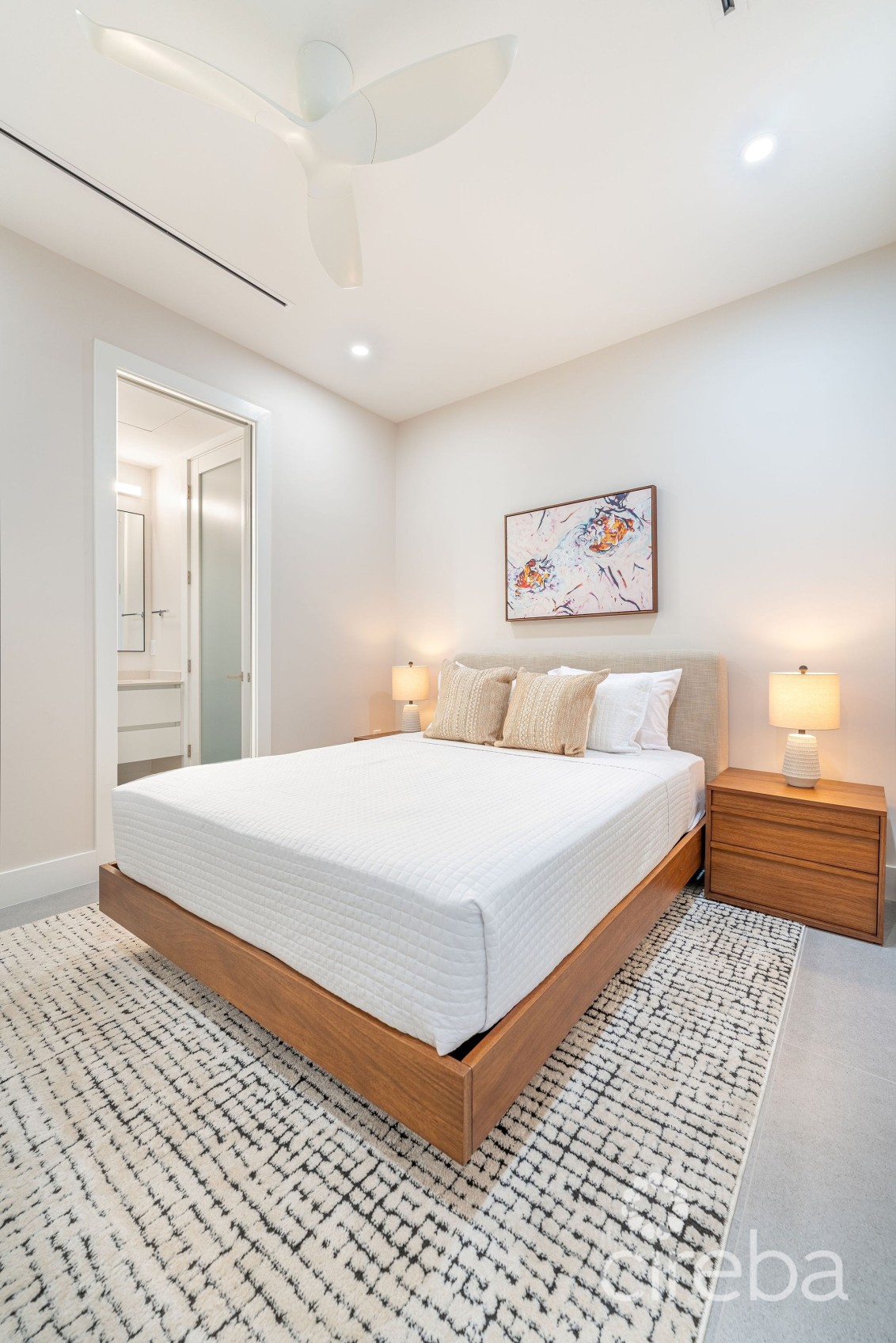 The primary bedroom features a king-size bed, elegant furnishings, and a peaceful layout designed for rest and privacy. The second bedroom adds flexibility for guests, family, or a dedicated work-from-home setup. With 2 full bathrooms, each featuring modern vanities and contemporary finishes, the condo provides the comfort and practicality expected of a brand-new Cayman Islands residence.
