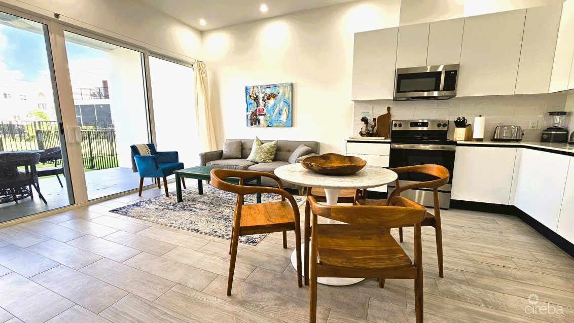 Situated in the quiet, gated community of Sapphire in the heart of West Bay, this well-appointed one-bedroom, one-and-a-half-bathroom condo offers 865 square feet of bright, thoughtfully designed living space. Ten-foot ceilings and large sliding glass doors create an open, airy feel and lead directly to a rare, generously sized private garden,fully fenced and ideal for outdoor living, entertaining, or simply enjoying a peaceful retreat.