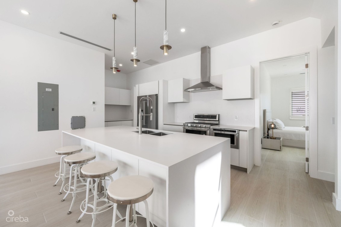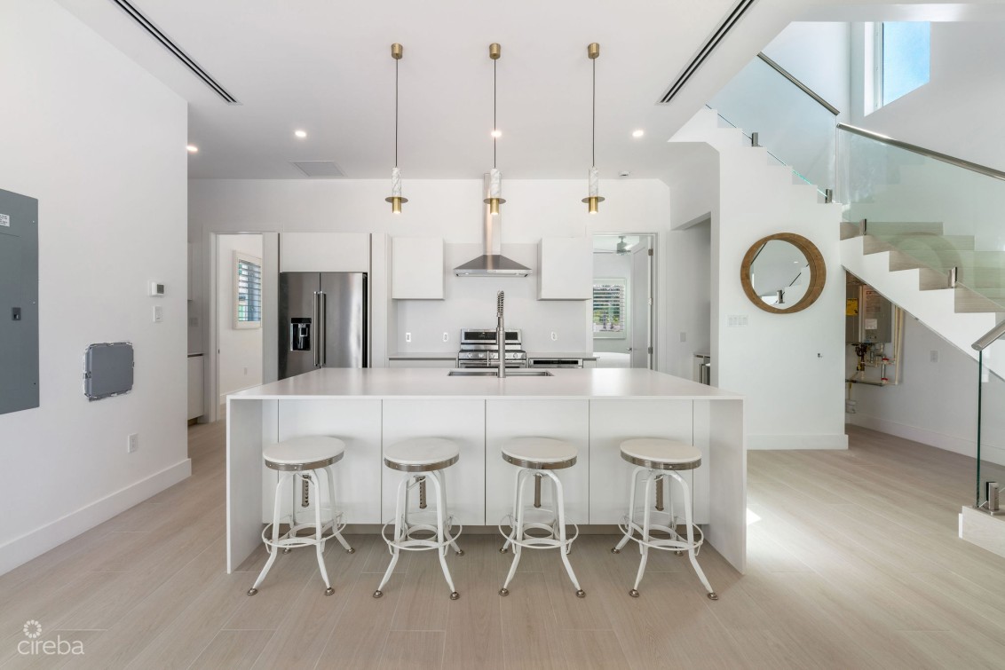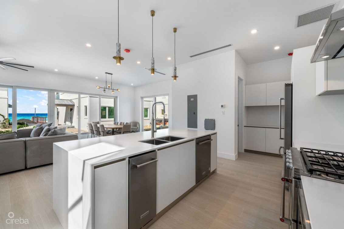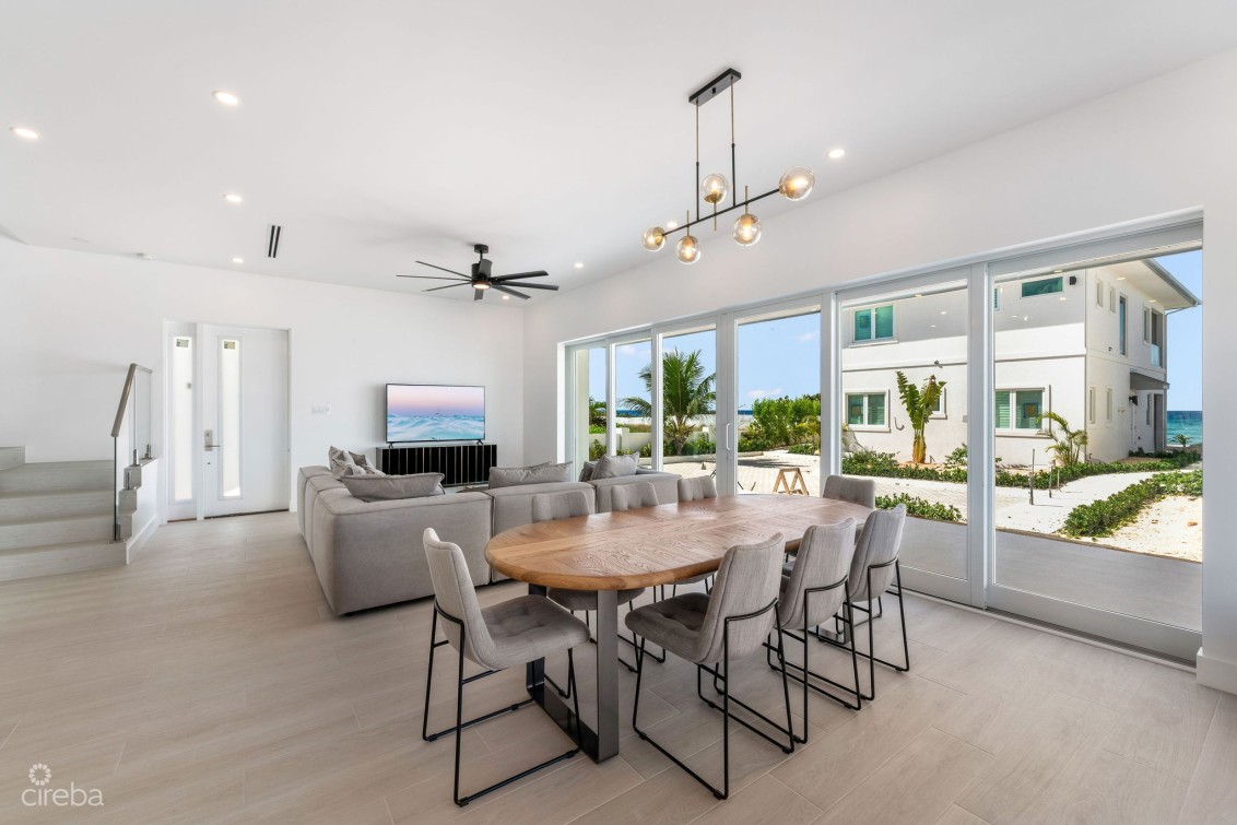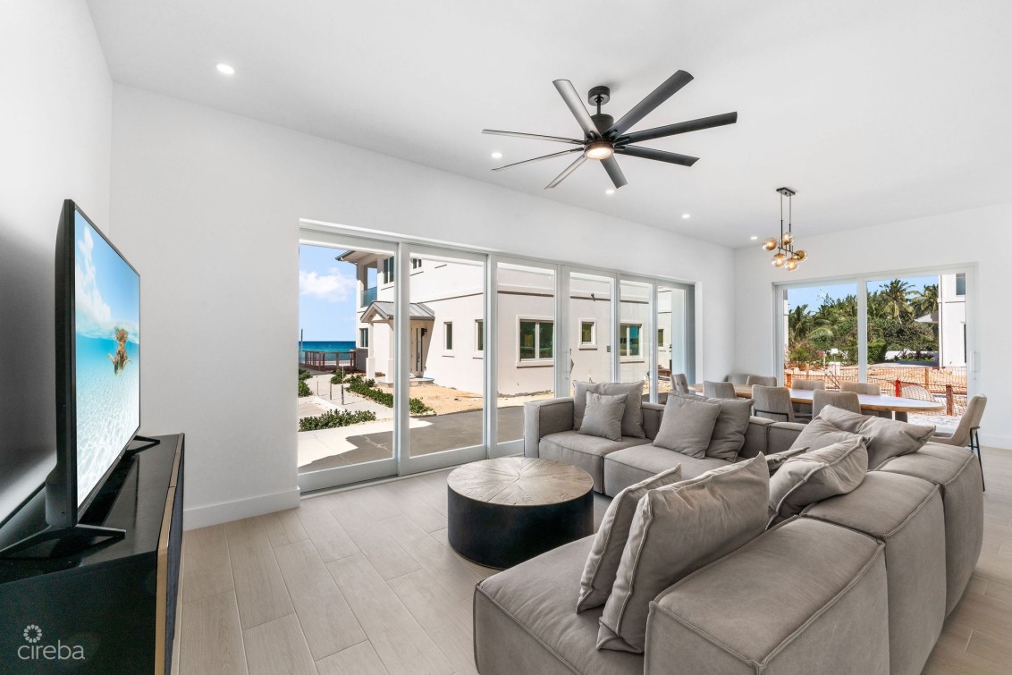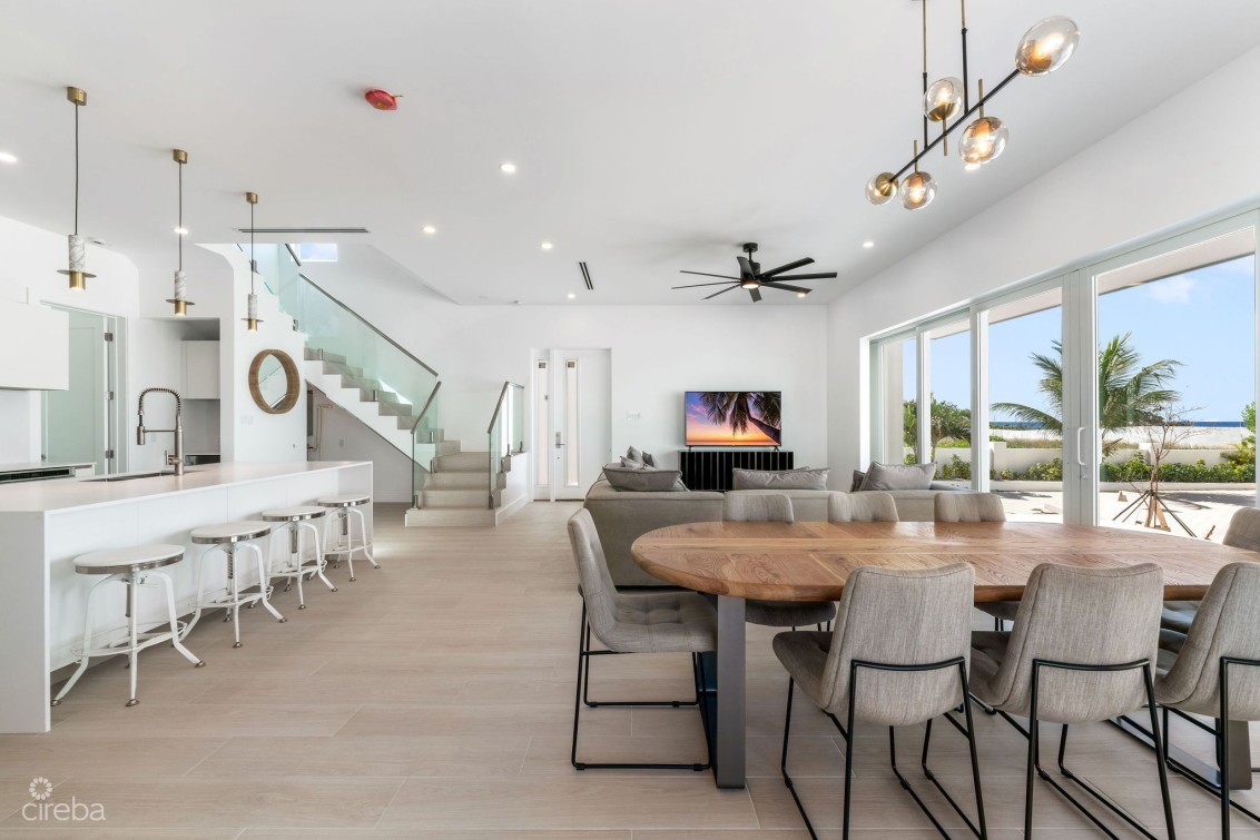 Direct ocean front resort style living in a unique detached home in Oceans 9, offering a rare opportunity to live in a fully managed and gated, oceanfront development. This home is turn key, fully furnished and ready to move into and includes 4 bedrooms, 4.5 bathrooms, plus garage. Bright open plan living room with ocean views, Kitchenaid appliances, dining area spilling out onto the top floor private patio, 10ft ceilings, 12ft above sea level, fully hurricane rated. Two dedicated parking spaces. Oceans 9 is situated on 2.3 acres of land with over 200 feet of North West facing beachfront, with a gated entrance and lush, stunning landscaping and two private pools connected by a lazy river to the ocean front pool. Communal outdoor kitchen with sunken lounge area, perfect for sunsets! Owners gym on site. A quarter mile further out, the drop off wall is considered one of the best scuba dive sites in the world. Arrange a tour today or call for more details